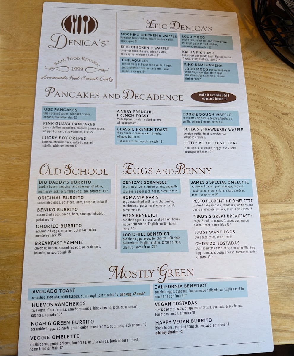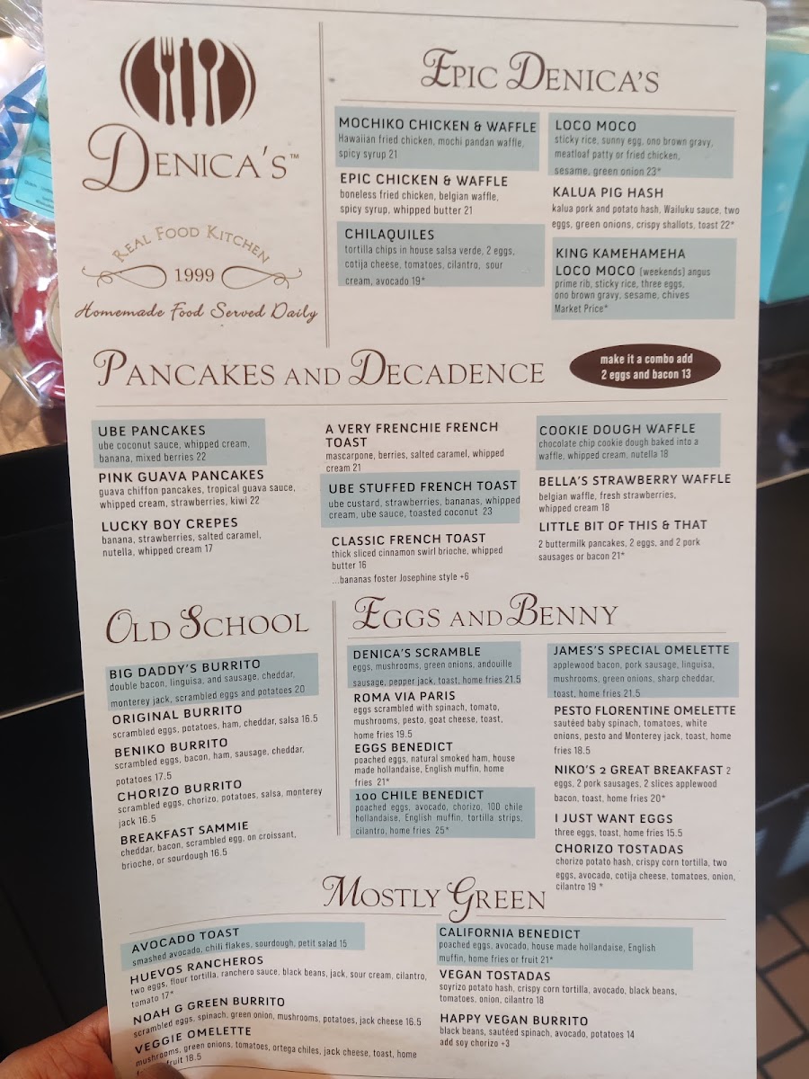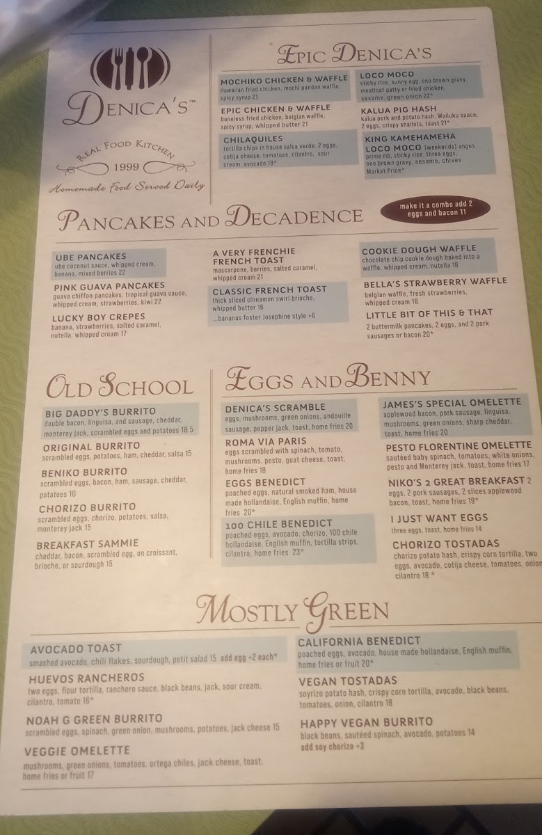 Denica's menu is a delightful mix of breakfast favorites and creative twists that cater to every palate. Start your day with their renowned Kimo's Mac Nut Banana Pancakes, a decadent stack that embodies the essence of morning comfort. Each fluffy pancake is rich with flavors that transport you straight to paradise. If you're in the mood for something more savory, the Epic Chicken and Waffle dish is a must-try, uniquely paired with spicy syrup that elevates each bite. For those who love a hearty breakfast burrito, their Big Daddy's Burrito promises to fill you up with a generous serving of deliciousness.
